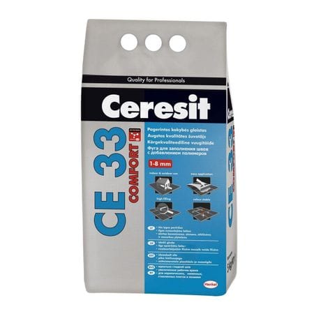 Ceresit CE 33 in nuanta antracit 13 este un chit pentru gresie si faianta, special conceput pentru rosturile cu grosimi de pana la 8 mm. Se foloseste pentru rostuirea placarilor ceramice de pardoseli si pereti, precum si a mozaicurilor din sticla si portelan, in interior, in spatii casnice aplicate pe suporturi rigide, nedeformabile. Inainte de aplicarea produsului, se recomanda ca rosturile sa fie desprafuite si curatate.Aplicarea se realizeaza cu ajutorul instrumentelor speciale de chituit. Timpul de punere in opera este de 90 minute, iar temperatura de aplicare trebuie sa varieze intre 5 grade Celsius si 25 grade Celsius. Zona pe care a fost aplicat chitul devine circulabila dupa 24 de ore de la aplicarea acestuia. Consumul orientativ variaza intre 0.35 kg / mp si 0.8 kg / mp, in functie de natura stratului suport si a tipului de dimensiunea placii. Ceresit CE 33 este ambalat in sac de 5 kg si are nuanta antracit 13.